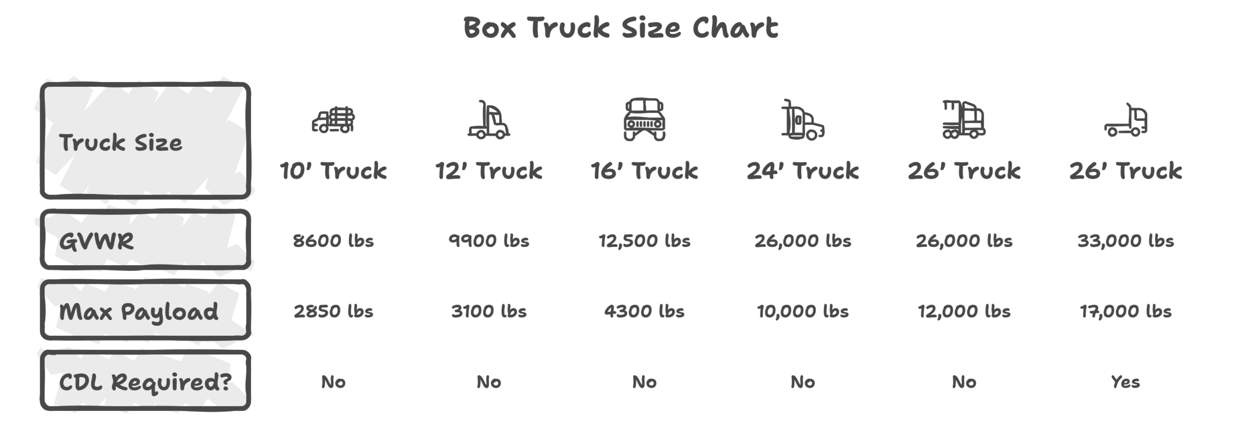 Box truck weight limits chart showing GVWR, payload capacity, and size specifications from 10ft to 26ft trucks