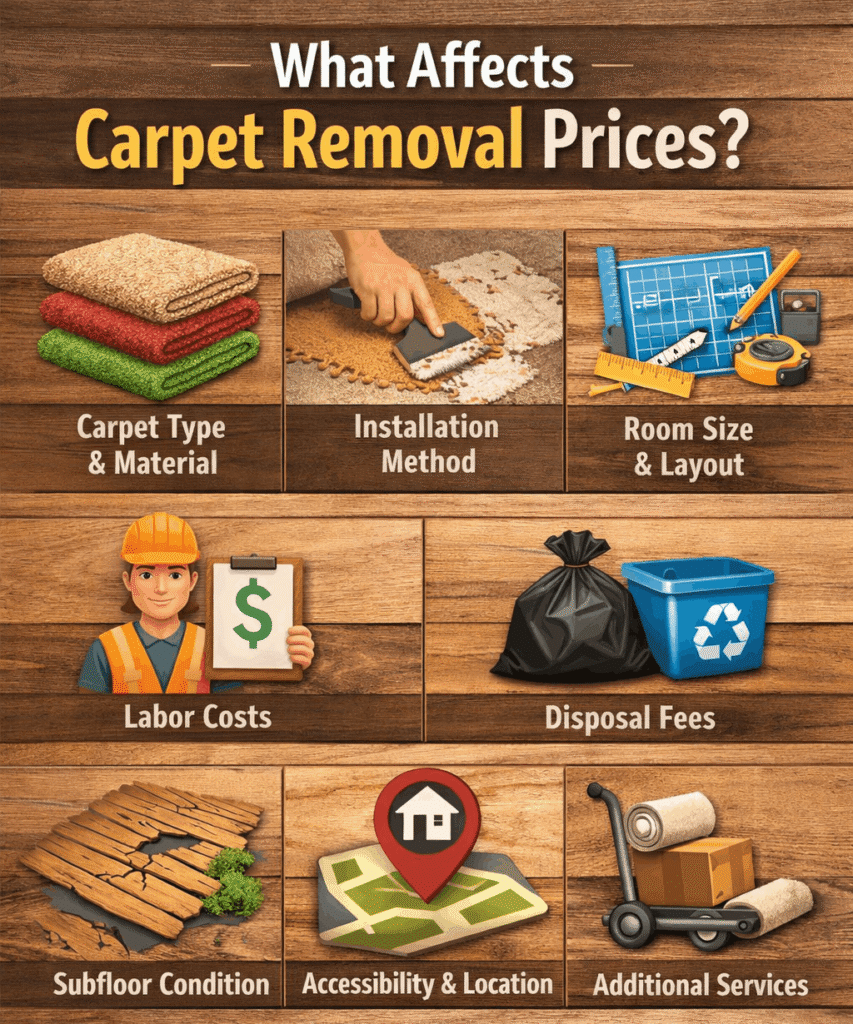 Carpet removal is not just about pulling up fabric. Several factors influence the final cost.