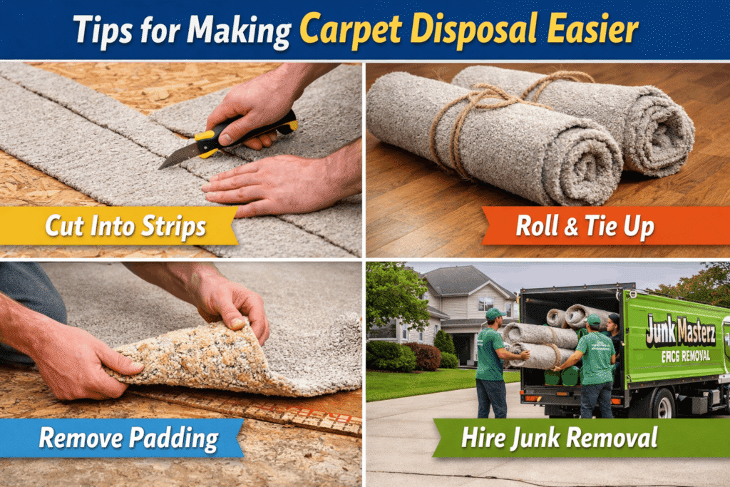 To prepare carpet for disposal, cut it into smaller strips about 3–4 feet wide so it is easier to handle. Roll each strip tightly and secure it with tape or rope. It is also helpful to remove carpet padding, nails, and tack strips beforehand to make transportation safer and easier.